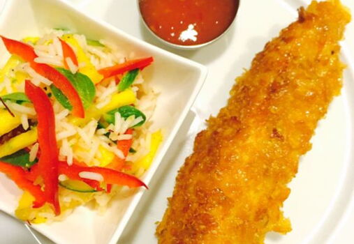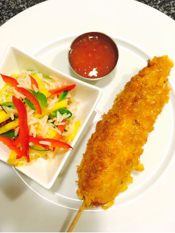 Das Crispy Chicken zusammen mit dem Reissalat und der Chilisauce servieren.