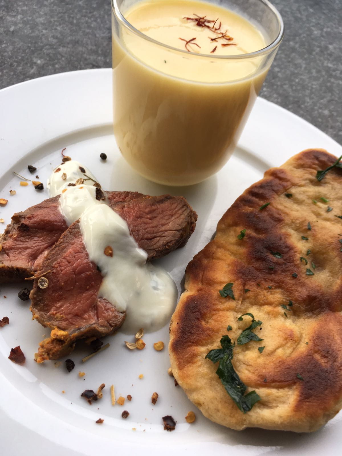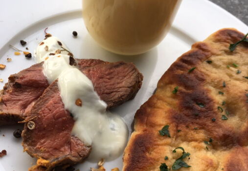 Die Lammhuft auftranchieren, auf den Teller geben und mit etwas Joghurtsauce nappieren. Das Brot mit Koriander bestreuen, den Lassi in ein Glas abfüllen und dazu servieren. Passend dazu kann ein Taboulé – Salat gereicht werden.