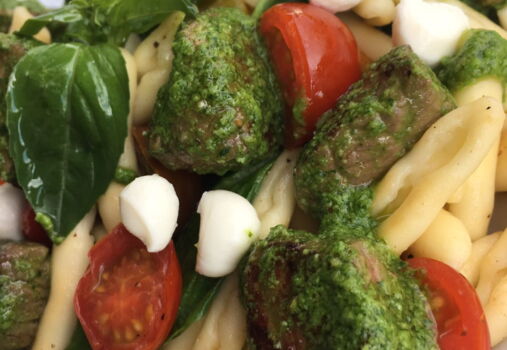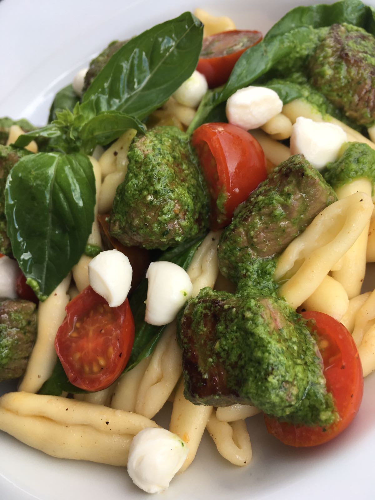 Die Rindfleischwürfel kurz sehr heiss anbraten, mit Salz und Pfeffer leicht würzen und bei 70° Celsius im Backofen warm stellen. Capunti in genügend Salzwasser “al dente“ kochen, abgiessen und mit etwas Olivenöl beträufeln. Cherrytomaten in einer beschichteten Pfanne kurz anschwenken, Capunti und Spinat zugeben, mit Salz und Pfeffer würzen, gleichmässig vermischen und sofort in einen tiefen Teller anrichten. Die Rindfleischwürfel im Pesto wenden und auf die Pasta geben. Übrige Pesto nach Belieben auf das Pastagericht verteilen. Mit den Mozzarellaperlen und den Basilikumblättern ausgarnieren.