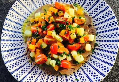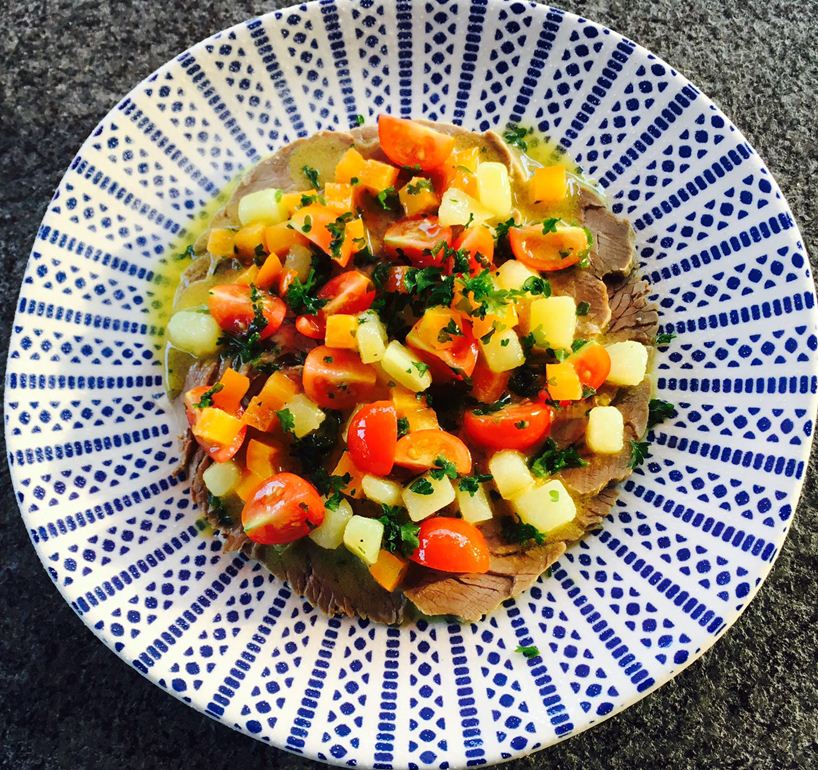 Das geschnittene Siedfleisch dünn auf einen Teller verteilen und mit reichlich Senf – Gemüsevinaigrette bedecken. Ein feines Stück Brot dazu und….