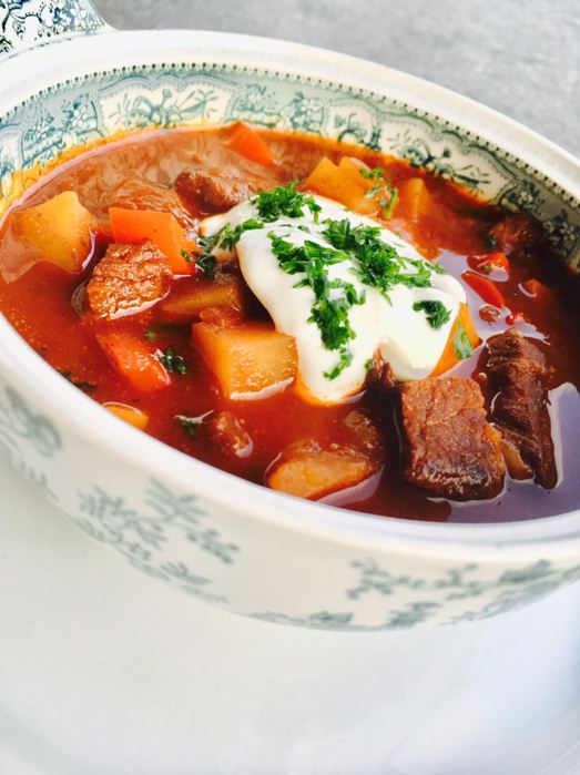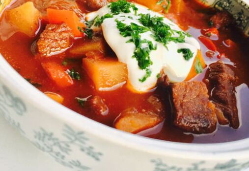 Die Gulaschsuppe nun in einem tiefen Teller oder in einer Suppenbowle anrichten. Mit Sauerrahm und Petersilie garnieren und mit einem feinen Stück Brot servieren.
