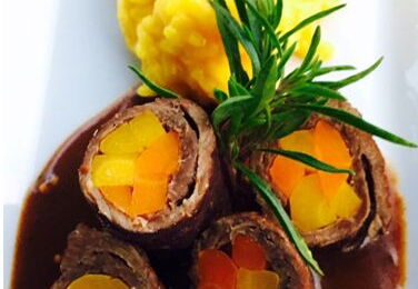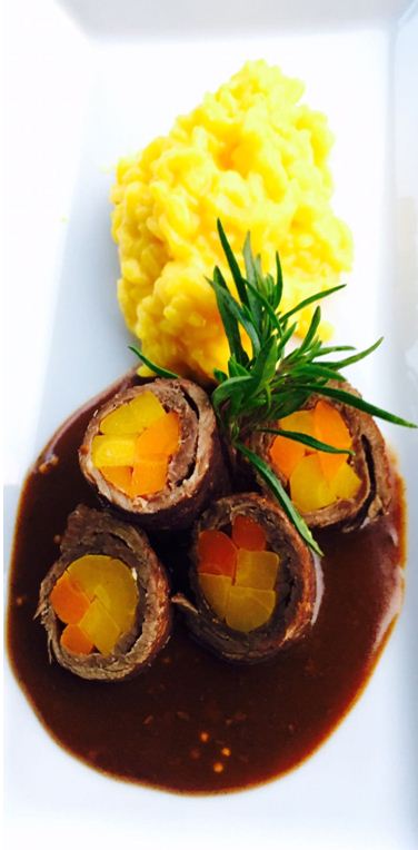Die Röllchen von der Schnur befreien und in die Sauce geben und kurz sorgfältig aufkochen. Mit der Sauce einen Spiegel anrichten, die Röllchen schräg aufschneiden und auf die Sauce setzen. Dazu einen feinen Risotto oder Kartoffelpüree servieren.