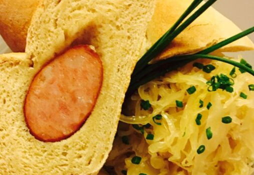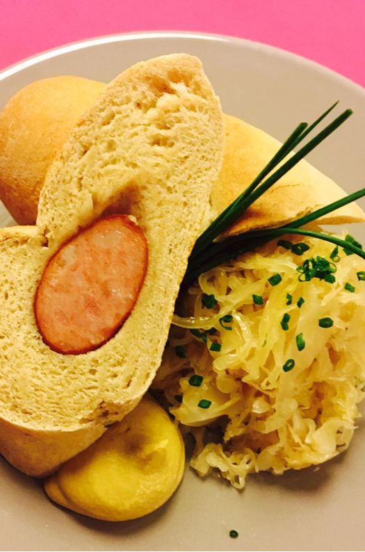 Die Wurstbrote aus dem Ofen nehmen, kurz etwas auskühlen lassen und mit Senf servieren. Passend dazu Sauerkraut oder Kartoffelsalat reichen.