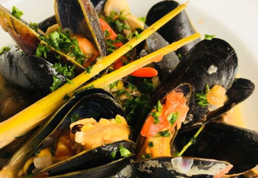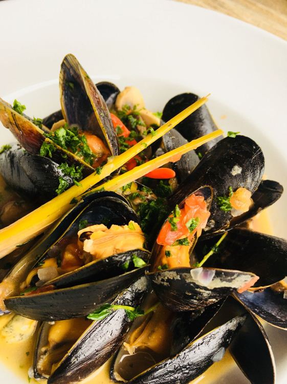 Die Muscheln in einen tiefen Teller anrichten mit etwas Sud übergiessen, mit Petersilie bestreuen und sofort servieren. Die Muscheln können als Vorspeise oder als Hauptgang mit Pommes frites serviert werden[nbsp] “Moules et frites“.