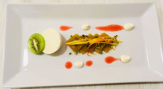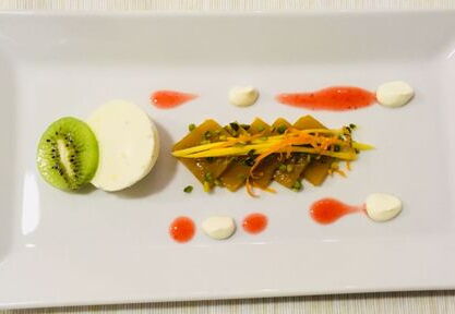 Und zum Dessert ein feines Limettenflan mit Mangogelée.