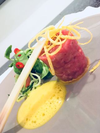 Als Vorspeise ein Tatar vom Thunfisch, Gurkensalat mit Grapefruit und Chili.