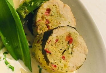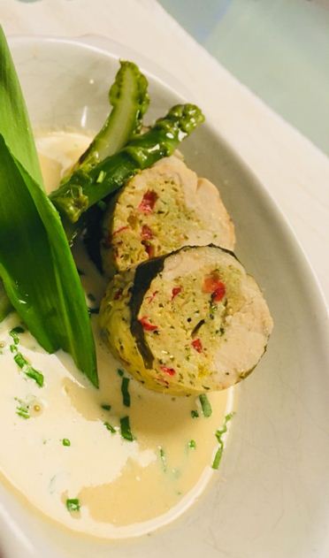 Die Pouletbrüste mit Salz und Pfeffer würzen, gleichmässig mit der Farce befüllen und dann satt in die Alufolie einwickeln. Die Enden straff eindrehen, dass eine Wurst entsteht. Nun die “Würste“ in eine mit etwas Wasser befüllte (ca. 2cm) Gratinform geben und für 20 – 25 Minuten in den vorgeheizten Ofen geben. Nach der Garzeit das Ganze aus dem Ofen nehmen und noch in der Alufolie ca. 5 Minuten abstehen lassen. In der Zwischenzeit den restlichen Rahm mit dem Mehl und etwas Salz und Pfeffer einmal aufkochen. Die Pouletrouladen nun aus der Alufolie nehmen und den darin enthaltenen Fleischsaft zum Rahm giessen. Die Sauce nochmals aufkochen, Bärlauch zugeben und in einen tiefen Teller anrichten. Pouletroulade aufschneiden und auf die Sauce anrichten. Mit etwas Bärlauch garnieren und sofort geniessen.