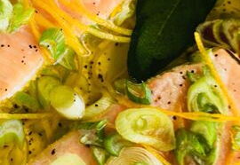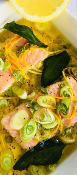 Ofen auf 70° Celsius Umluft vorheizen. Aus der Zitrone Zeste herstellen und den Saft auspressen. Frühlingszwiebeln waschen und in feine Ringe schneiden. Lachsfilet mit Salz, Pfeffer und etwas Zitronensaft würzen. Restlicher Zitronensaft mit Oliven- und Sonnenblumenöl vermischen. Lachsfilet in ca. 2 Zentimeter dicke Tranchen schneiden und flach in eine Gratinform einschichten. Zitronenzeste, Frühlingszwiebeln, Salbei und Chili über den Lachs verteilen und mit dem Öl ganz bedecken.